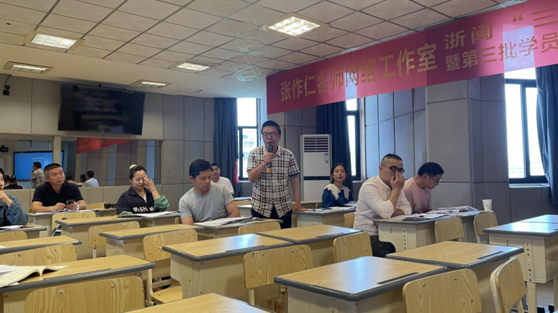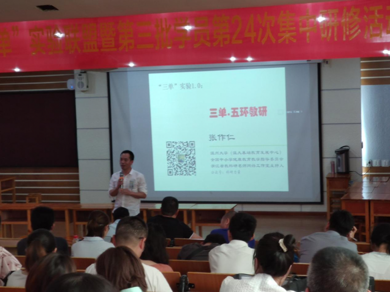 来自温州大学的张作仁教授做了专题讲座《基于作业优化促进深度学习研究》。张教授详细地阐述了“三单”实验理论架构以及研究设计。他说,“三单”实验即基于作业优化促进深度学习研究,是指向“备教学评”常规优化的教研项目,“三单”核心技术在于“三单.五环”教研记录表,大家如何运用好教研记录表进行辨单、观单、议单、调单。张教授再三强调,做“三单”是集集体智慧,达到资源共享。张教授勉励在座的教师们,做“三单”苦三年,不做“三单”苦一辈子。