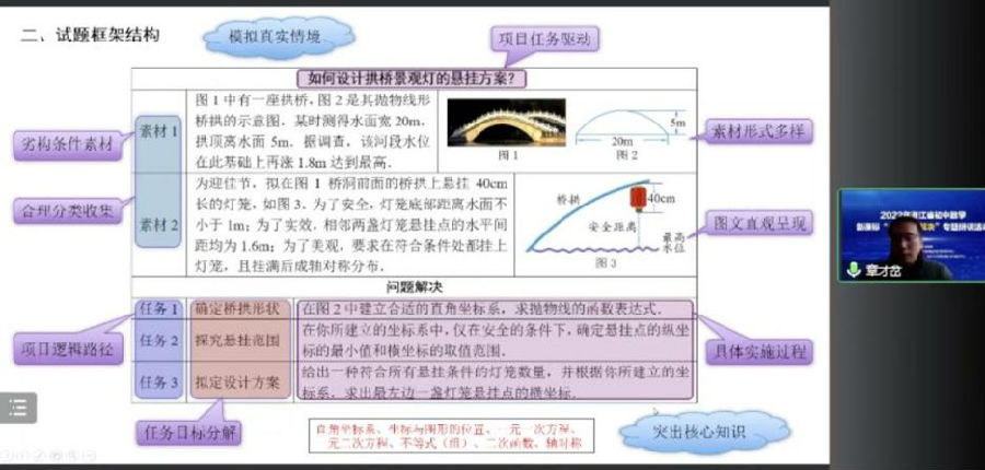 下午是六位命卷组专家带来对于命题设计与教学设计的说明,温州市教育教学研究院章才岔老师分享了2022温州中考23题的命题意图以及试题的框架结构,本题旨在引导学生经历项目化学习的过程,通过项目学习,项目评价,项目作业让学生经历现实情境数学化,经历分工合作,实验调查,建立模型,计算反思,解决问题的过程,突出关键能力。并期望能以此影响甚至改变学教观念,倡导“师主导,生主体”的学教方式,让学生综合运用知识,注重知识的系统化整理、结构化储存,提高学生的知识综合运用能力。