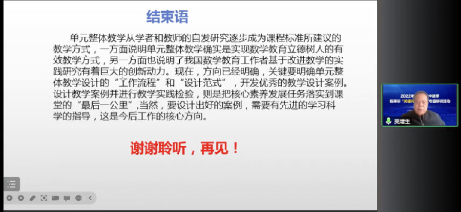 28日上午,浙江省特级教师张宗余,特级教师吴增生分别带来专家报告《探索与展望:核心素养视域下试题研制的浙江实践》和《用整体教学追求核心素养发展》,他们以真实的、具体的试题和教学设计实例,聚焦新标准在课程目标、课程内容、教学方式、考试评价等方面的要求与变化,践行“教学评一体化”。最后,浙江省教育厅教研室陈荣荣老师对本次新课标“关键问题解决”专题研训活动从三个方面进行了总结:分别是教学评一体化的必要性、核心要素以及教学评一体化如何推进,并呈现了教学评一体化省级推进框架,提出了省市县校的推进建议,为浙江初中数学一体化推进课程改革、践行新课标理念与要求指明了方向,为本次专题研训画上了圆满句号。