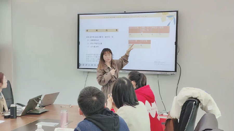 首先,徐淳淳老师以SOLO分类理论的数学理解能力水平为依据,设计了一系列前测问题分析解答学生们对小数已经有哪些认知?他们的认知所表现出来的思维层次是怎样的?郑霜霜老师、蒋琳老师也对本班学生展开了前测,利用画一画的形式进行小数的概念表征。通过这些前测,发现在小数的含义理解上,学生们更多呈现的是分散的小数知识的认知,对于小数本质(十进制)的认识是比较薄弱的,对于分数与小数的关系认知是不够系统的。