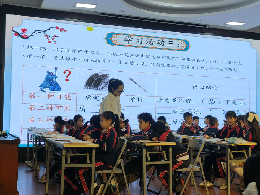 两节课例诠释了深度学习如何在课堂中真实发生。设计有巧思,寻找“智者代言人”,龙湾区海城第一小学朱丽平老师的课例展示是五年级下册的《自相矛盾》。朱老师立足学生本位,纲举目张,延展思辨型课堂;披文得理,创编《新自相矛盾》。从抓单元要素和课后练习训练来设计教学环节,通过引导学生初读,读正确;再读,辩思维;升华读,悟道理;联系实际拓展延伸,训练孩子们学习文言文的能力。整个教学环节环环相扣,让学习真正发生。