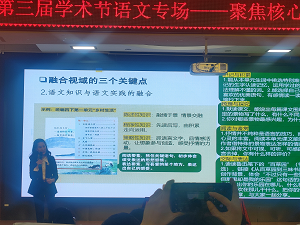 生活而翔实的大单元设计例举之后,周导明确指出学习任务群的建设,要实现三个转向:转向一,从任务核心要义出发精准定位教学目标;转向二,从统整课堂形态出发确认课堂教学表征;转向三,从概念性理解出发统整单元学习进程。以五上第五单元为例,周导提出融合的第一个关键点在于融合视域下的“文本视域与学生视域的融合。除了教的逻辑,还要分析学生的认知逻辑,巧用已知与需知相勾联。本单元的设计可以基于融合视域,根据不同说明目的和对象特征搜集适用的信息,选择恰当的说明方法和语言风格介绍一种事物。