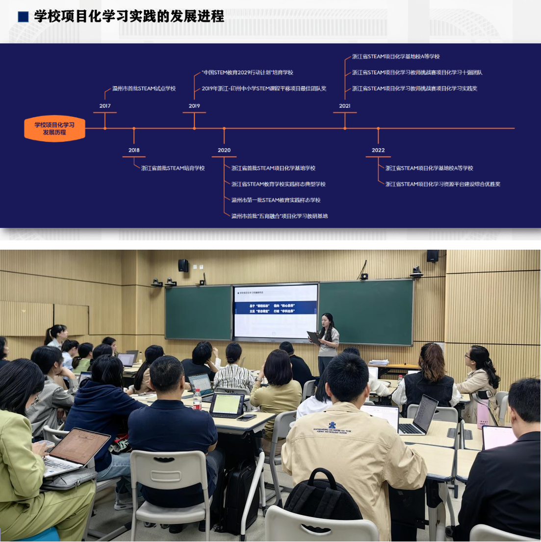 首先大家在不同会场聆听了初中不同学科的项目化学习课堂,季赛慧老师的语文课以“有朋自远方来”为主题,通过制作“龙湾有礼”亚运伴手礼包,引导学生更好地理解“交友之道”。陈宛怡老师则通过数学课展示了“匠人之道---角平分仪”,培养学生抽象能力和逻辑推理能力。朱君嫦老师的英语课以“温州旅游攻路之交通指南”为题,让学生为游客设计旅游交通指南,提升学生的实际运用能力。叶赛雅老师则通过科学课展示了“自制温度计”的项目,引导学生进行设计、制作和改进,培养团队协作和创新思维。严贝贝老师的社会·法治课通过对龙湾历史、地理、经济等多角度的分析 “寻找发展密码,为龙湾建区四十周年献礼”,培养了学生的综合素养。