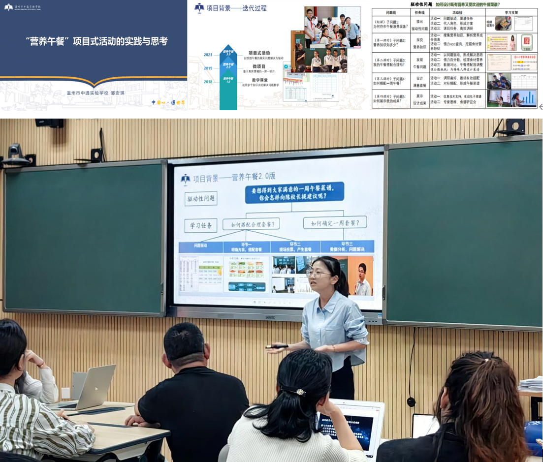 温州市中通实验学校的邹安祺老师介绍了一个数学学科项目:《营养午餐》,这个项目经历了从数学课题到微项目,再到项目式活动的三个阶段的研究。最后聚焦于驱动性问题:如何设计既有营养又受欢迎的午餐食谱?学生将模拟“信息工程师”、“分析师”和“营养师”等角色对“营养知识知多少?”“我的午餐搭配合理吗?”等一系列的子问题进行探究。