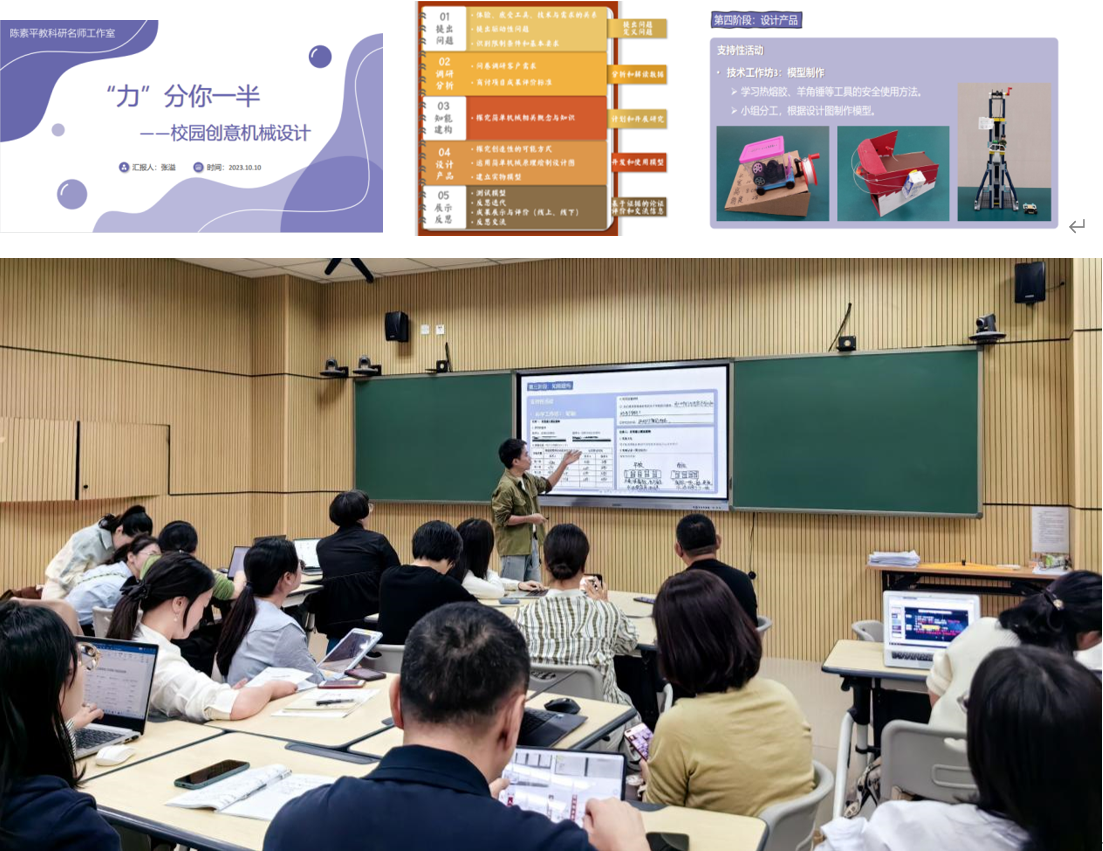 温州市广场路小学张溢老师介绍了科学学科项目:《校园创意机械设计》,这个项目基于孩子们在学校中遇到的搬运重物的真实困难展开,以“校园里没有安装电梯的条件,我们可以设计一种怎样的简单机械装置或技术,帮助校园里的人们安全、轻松、方便地搬运重物上下楼?”为驱动性问题,学生通过对六上科学“工具与技术”单元的探索,创意设计机械装置或技术来解决这一问题。