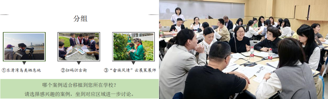 在缪旭春老师的组织下,学员们自由分组,选择“乐清湾鸟类栖息地”“扫码识古街”“畲族风情云展策展师”中的一个项目进行研讨,借助“任务单”在案例理解中提炼可迁移运用于项目化学习实践的要领。