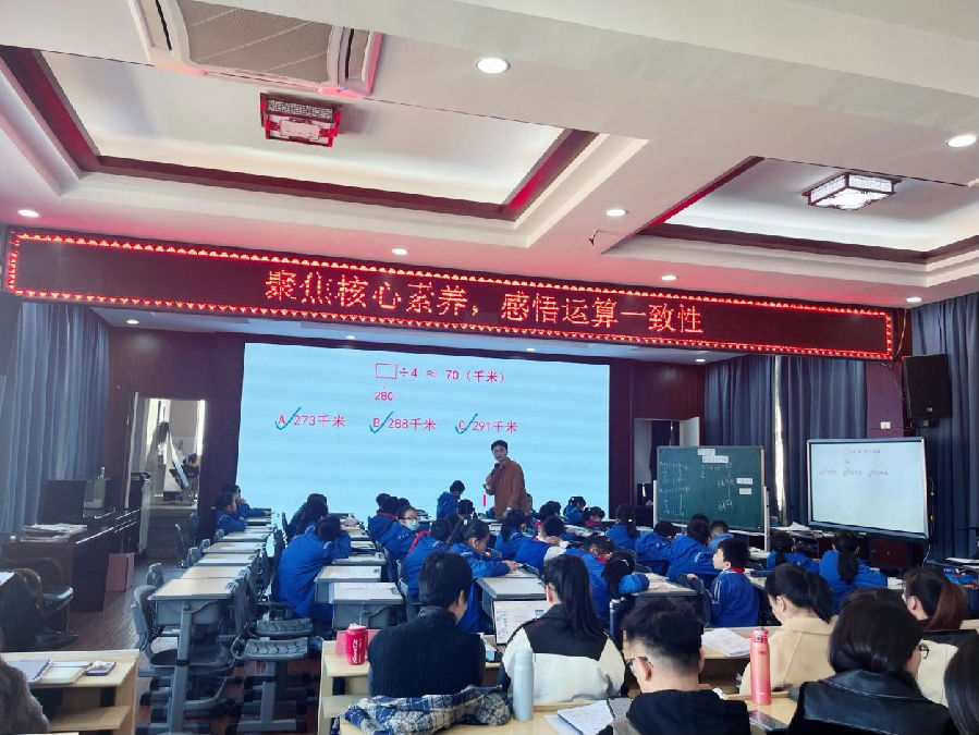 第二节课由温州市藤桥小学的潘郑坚老师带来的研讨课《口算除法估算解决问题》。潘老师从李叔叔的骑车旅行引入,引导学生选择合理简洁的运算策略解决问题。通过讨论,展示了学生估算273÷3的不同方法,让学生感悟了不管估大还是估小都应考虑合理范围内的口算的简便。随后通过变化除数的大小,让学生感悟到在用口算除法估算解决问题时,除了考虑估算结果的合理性,还应考虑计算的简便性,层层递进,深度剖析,最后通过数轴的展示,打破思维定势,采用逆向思维,让学生通过估算的结果和除数,确定被除数的合理范围,为笔算除法中的试商、调商作铺垫。