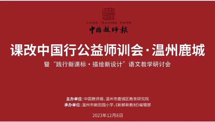 为践行课标精神落实语文核心素养,进一步引领对新课标的深入研究,2023年12月8日,由《中国教师报》联合温州市鹿城区教育研究院共同主办,温州市新田园小学、《新解新教材》编辑部联合承办的2013年课改中国行(温州鹿城)公益师训会,暨“践行新课标,描绘新设计”语文教学研讨会在温州市新田园小学召开。