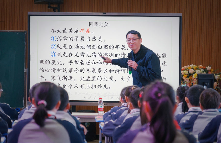 第二节课,杭州市天长小学的蒋军晶老师展示《四季之美》课例。蒋老师立足学生主体切入教学,提出 “你写四季会选择哪些景物?” 问题。在学生的积极回答声中,蒋老师顺势拿出一篇大众眼中的《四季之美》与作家清少纳言的文章对比。在层层追问和深度思考下,孩子逐渐感受到作家笔下四季选材和表达的独特,促进语言的积累和思维能力的发展。