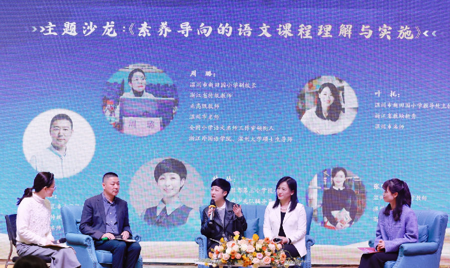 下午的主题沙龙由周璐老师担任主持,吴孔裕、叶托、林丛和张坚鸥四位老师担任嘉宾,围绕“素养导向的语文课程理解与实施”主题展开探讨。周璐老师提出了三个问题:即“在新课标的背景下,你是怎么理解语文课程的?”、“结合今天早上的三堂课例,素养导向下的语文课堂应该怎么上?”以及“如果再看这三堂课,让你来上的话,你会在哪个板块、哪个任务进行调节,让它呈现真学的效果?”。四位嘉宾围绕新课标分别阐释了自己对素养课堂的独到见解,提出把课堂还给学生,让学生成为课堂的主体,以语言运用为基础,以思维能力为支撑,践行大语文观下面的小课堂教学,学生要在课堂中品味语言,让思维、语言、文化和审美和谐共生。