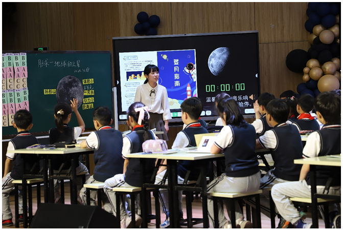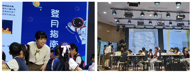 第一堂课是由温州大学城附属学校的陈翔老师带来的《月球——地球的卫星》。陈老师以我国探月工程入手,引领孩子们走进登月训练营。通过月球知识大盘点的活动通过科学阅读获取月球相关知识,再到环形山建造师的实验探究验证陨石撞击学说,最后设计登月探险计划。陈老师亲切、温柔的语言拉进距离,三年级的孩子们在轻松愉快的氛围中亲历观察发现、提出假说、模拟实验、验证假说的过程的科学研究过程。