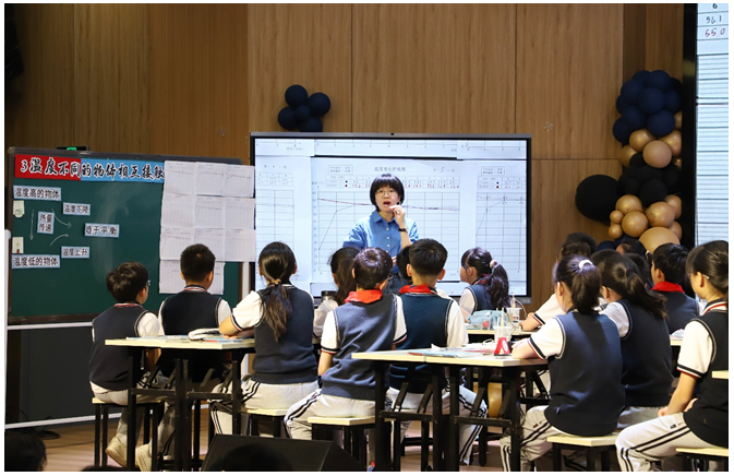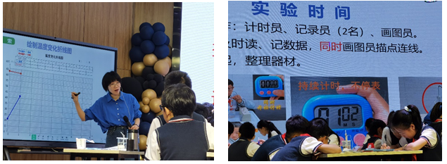 紧接着由瓯北第一小学的吴玲娥老师带来的《温度不同的物体相互接触》一课。吴老师从早上热牛奶的问题导入,引导孩子们对热水和冷水相互接触温度会如何变化进行预测,并设计实验。学生经历连续8分钟的记录,形成温度变化折线图,学生据此研讨发现热传递与热平衡的奥秘。