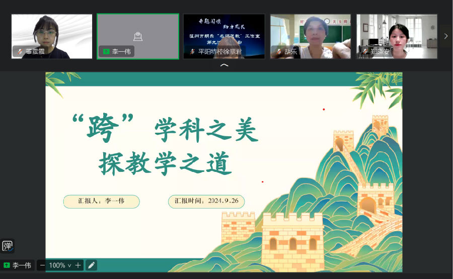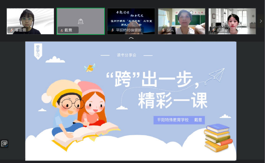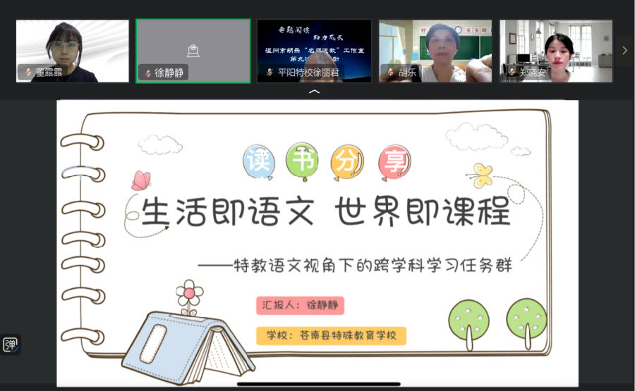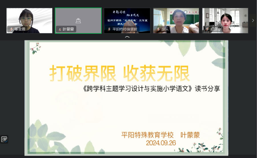 为进一步发挥温州市胡乐“名师送教”工作室的带头辐射作用,引领工作室学员专业成长,促进学员形成爱读书、会读书、读好书的良好习惯。2024年9月26日温州市胡乐“名师送教”工作室组织全体学员开展了《跨学科主题学习设计与实施》线上读书分享活动,瓯海区资源教师团队参与学习。本期分享会由平阳县特殊教育教研员徐丽君主持。