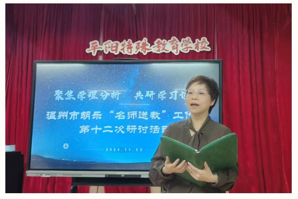 秋日共研,催开一树桂香。为充分发挥名师工作室的示范引领和辐射带动作用,2024年11月3日,温州市胡乐“名师送教”工作室全体成员相聚平阳特殊教育学校,邀请正高级教师杨州老师,针对“说课”开展主题为“聚焦学理分析,共研学习设计”的研讨活动。本次活动分为分组说课、专家点评、活动小结三个流程。