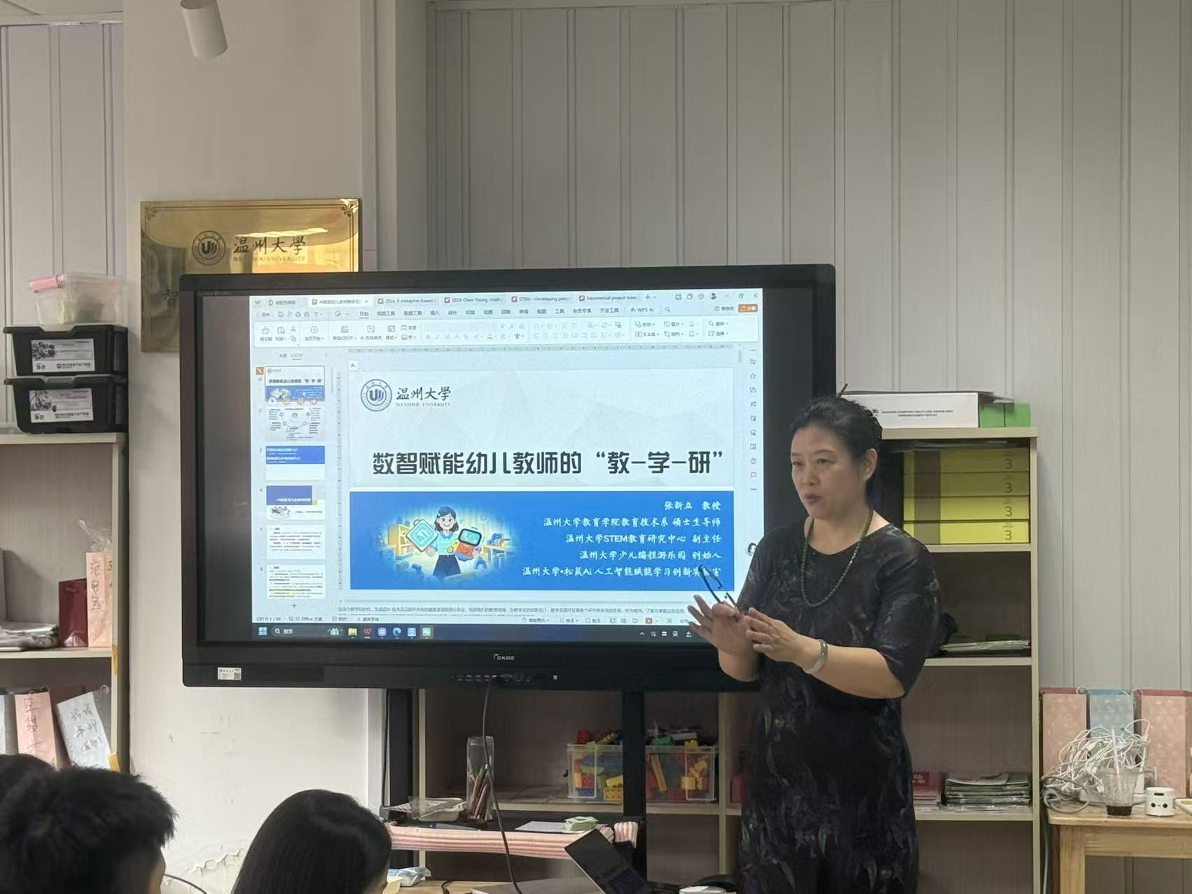 下午的活动由温州大学教发中心胡来林教授的讲座开启。胡教授以《人工智能+教育:学前的思与行》为题,从理论到实践,从现状到未来,为学员们描绘了一幅“人工智能+学前教育”的生动图景。在交流环节,学员们踊跃提问,与胡教授进行了深入的探讨,现场气氛热烈。