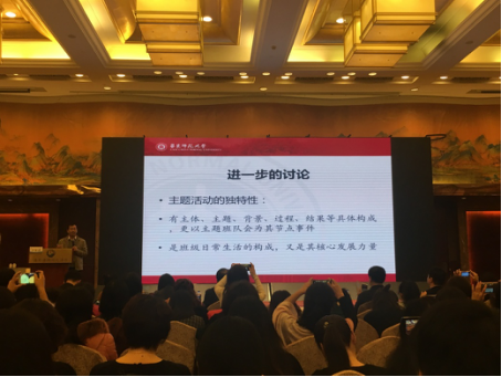 在张红教授的介绍下,华东师大教授李家成老师在掌声中出场。他的《以主题活动创新促成班级日常生活更新》讲座,以一个学者的理论高度,结合鲜活的教学实践。从学生立场、育人价值、综合策划、动态生成、综合融通层面,以一个个生动的班会活动课方案的方式,诠释了基于学生和育人为本的教育理念。