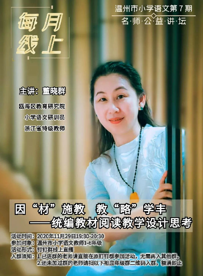 专题讲座:《因“材”施教 教“略”学丰——统编教材阅读教学设计思考》,主讲:董晓 浙江省特级教师 温州市瓯海区教育研究院