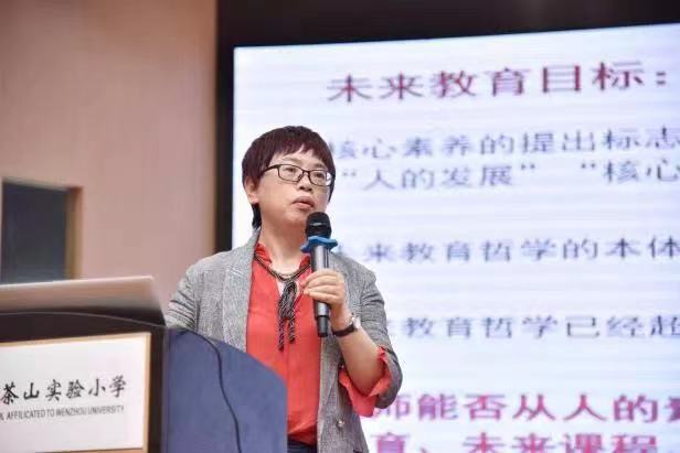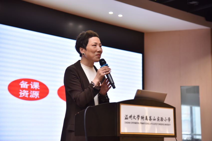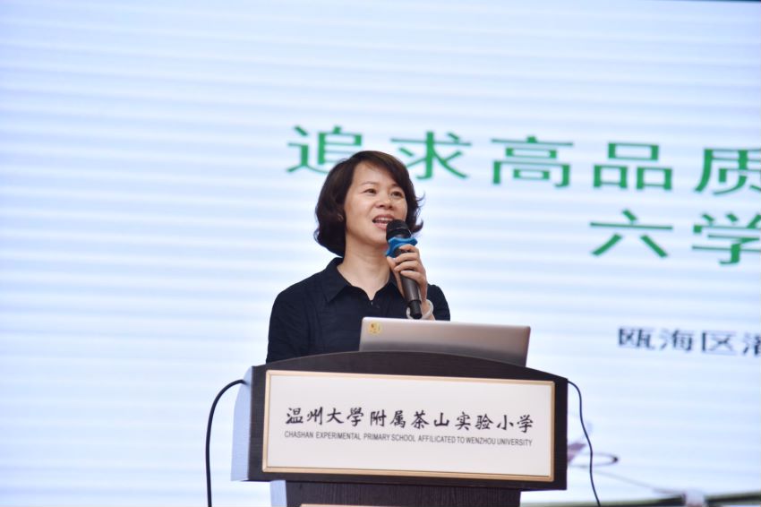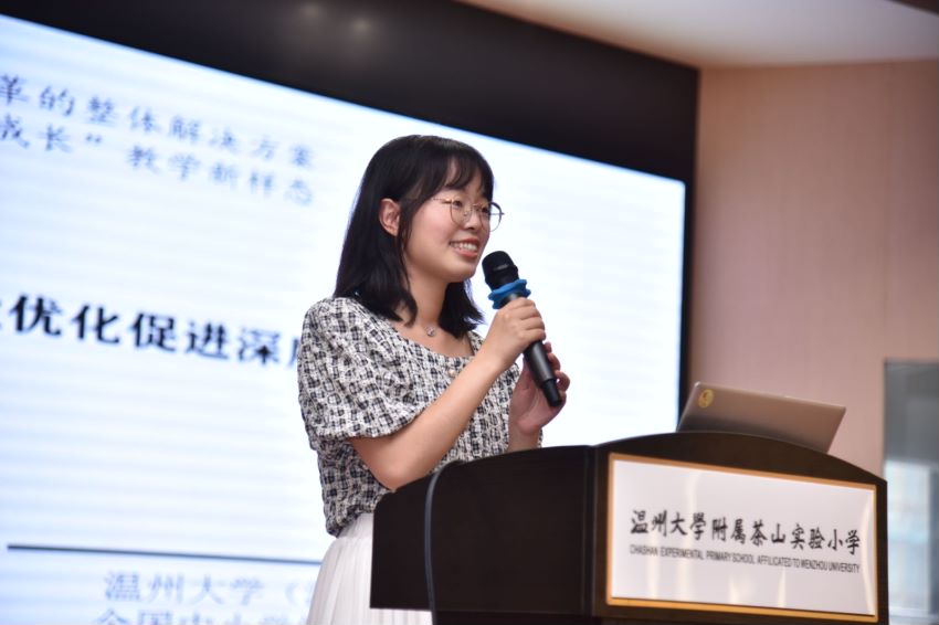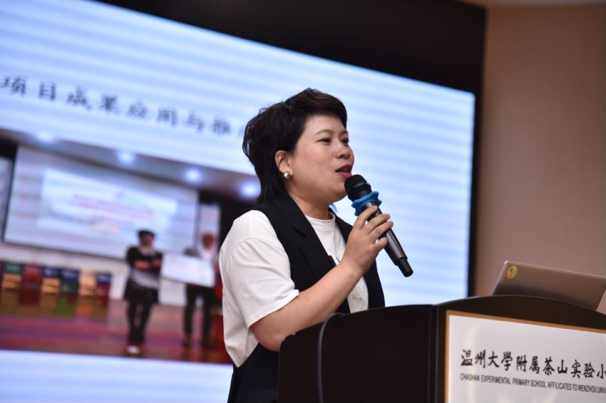 在温州大学附属茶山小学会场,温大基础教育发展中心张作仁教授团队给大家展示了《“三单”实验:基于作业优化促进深度学习研究》理论架构与实践成果。团队核心成员项思思向大家阐述了“三单”实验拟解决的问题、实践载体、研究路径与方法、成果主要内容、项目成果影响力等,随后由四位“三单”实验成果应用与推广学校的校长分享了项目实践成效。