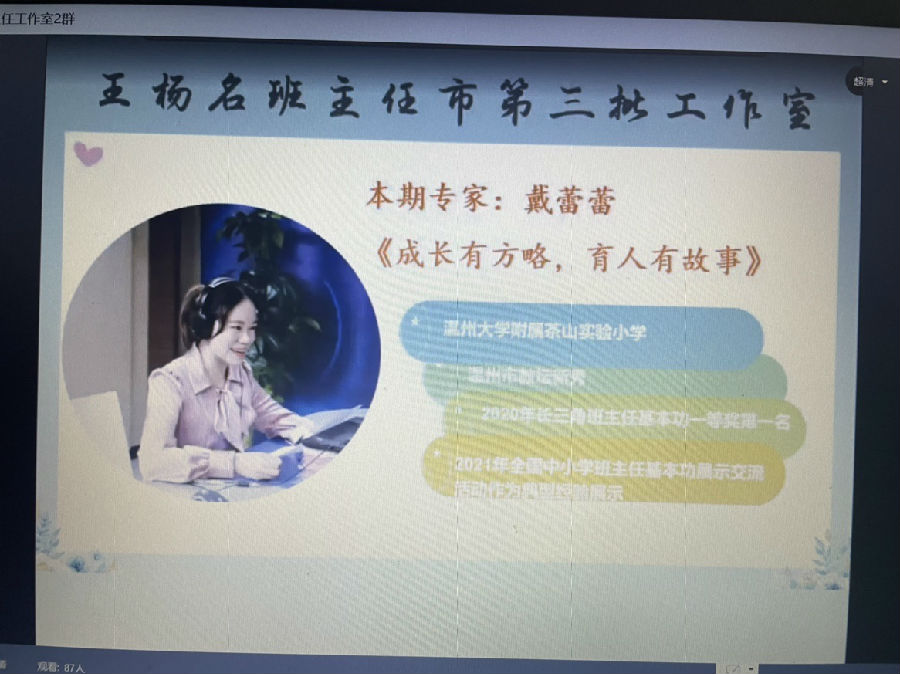 3月25日晚上7时正,苏彩宋“名师送教”工作室的全体学员们准时集中,聆听温州大学附属茶山实验小学戴蕾蕾老师的讲座。戴老师的讲座分两个专题:《成长有方略,育人有故事》和《故事,有点料》。戴老师年纪很轻,可成绩斐然:她先后荣获温州市教坛新秀、2020年长三角地区班主任基本功大赛一等奖,温州市班主任优质课一等奖,并于2021年在全国中小学班主任基本功比赛中做了展示。晚上的讲座在戴老师的富有亲和力的话语中拉开了序幕。
