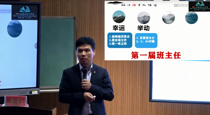 下午,陈建仁老师为我们做了主题讲座:《活动育人视角下的班主任工作和团队建设》。活动是学生很喜欢的形式,陈老师表示班主任工作一定要有许多的活动,班主任就是要通过许多的活动来达到育人的目的。