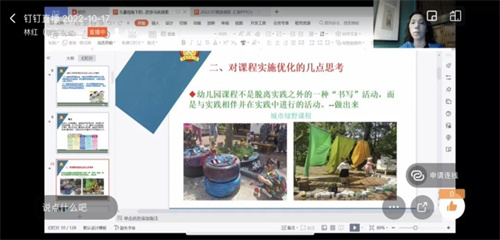 讲座伊始,林老师结合张雪门以及冯晓霞、虞永平教授对课程的理解,明确指出了“一日活动皆教育”,幼儿园的课程是有情感参与、有意义且落地的。接下来,林老师提出了自己对课程实施优化的几点思考。首先她提出,幼儿园课程不是脱离实践之外的一种“书写”活动,而是与实践相伴并在实践中进行的活动。并且,林红老师认为课程的实施是最重要的环节,而老师是课程建设与优化的主体,始终要坚持“儿童是课程主人”的立场。随后,林特结合了大量的案例,让大家非常直观地理解和分辨出“儿童视角”和“成人视角”的不同理念,提出课程内容要链接儿童的现实生活经验,链接教师经验与儿童经验,同时还要追随儿童的自我建构需求,让其主动建构。