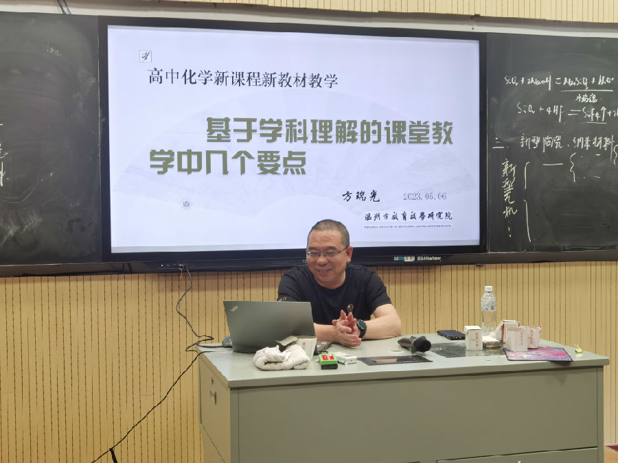 下午,温州市高中化学教研员方瑞光老师做了题为《基于学科理解的课堂教学中几个要点》的专题讲座,方老师结合课堂教学实例,从基于学科理解的课堂教学表达、课堂教学要点和课例分析这几个角度出发,阐述该如何设计一节好课。他指出一节好课应具备趣味性、传授性和有效性。