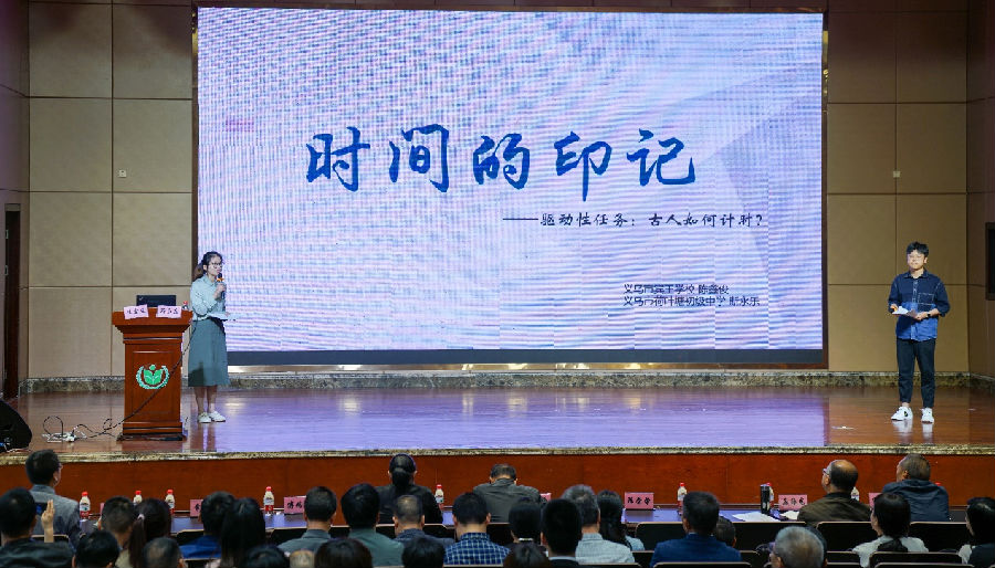 接着义乌市兵王学校陈鑫俊、义乌市荷叶塘初级中学斯永乐两位老师联袂带来《时间的印记——驱动性任务:古人如何计时? 》这一项目化案例分享。他们从项目背景、项目简述、驱动问题、实施过程、成果评价、成效反思这六方面来论述。并总结项目化学习是具有变革性的课堂教学,要求老师们变革教学理念、变革培养要求、变革组织形式。