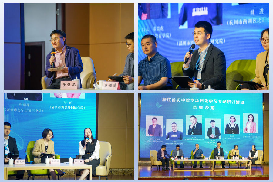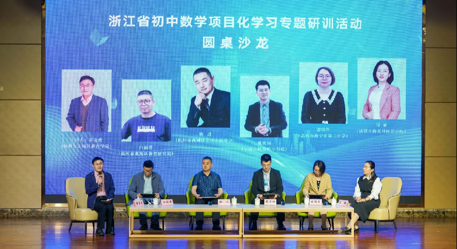 接着展开项目化学习为主题的圆桌沙龙。本次圆桌沙龙由杭州市上城区教育学院董贵虎老师主持,宁波市镇海蛟川书院戴炎炳老师、诸暨市海亮外国语学校马丽老师、温州市瓯海区教育研究院白福清老师、杭州市西湖区之江实验中学姚进老师、嘉兴市海宁市第三中学张瑞萍老师参与沙龙研讨。