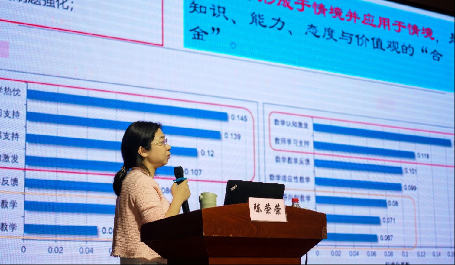 最后浙江省教育厅教研室初中数学教研员陈荣荣老师对本次研训活动进行总结,她首先对已开展项目化学习县(区)的学校部分教师的问卷调查结果进行分析,提出现阶段学生的学习状态是割裂的、低阶的、封闭的、机械化的。而这样的学习不利于学生未来发展,陈老师总结出学生素养形成于情境并应用于情境,是知识、能力、态度与价值观的“合金”,突出了我省开展项目化学习的必要性,接着陈老师提出当下项目化学习推进出现了项目跨学科数学线索链不凸显、项目设计收放尺寸把握不准、项目指导主导倾向太重,项目化过于 “专业”等问题,陈老师结合巴克教育研究所关于项目化学习的八大黄金准则做了全面、具体的阐述和说明,并提出科学推进项目化教学方法,给在座老师指明方向。陈老师希望数学老师要以项目化学习来推进常态化课堂的变革,最后陈老师送给在座老师们一句话 “改变一点点,一点点改变”。相信本次研训活动将引导更多初中数学教师投入到项目化学习的实践中来。