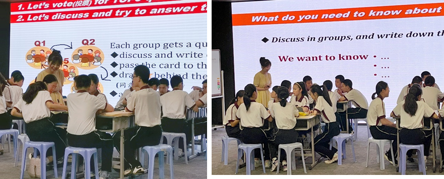 首先,来自温州实验中学的刘琴老师开设了七年级下册M11 Body Language项目化学习的入项课。刘琴老师以Let's chant 的活动,结合body language的相应内容欢快地和学生互动展开课堂。同时刘琴老师以即将到来的亚运会为背景,提出本节课的驱动性问题 “How can we make foreigners feel welcomed?”。学生通过教师的引导和辅助,小组成员间的讨论互助,对使用肢体语言会遇到的问题和解决措施进行了讨论分享。整堂课充分体现了学生中心,学生能够在教师和同伴的引导下发现问题,分析问题和解决问题,引导并发展学生的核心素养。