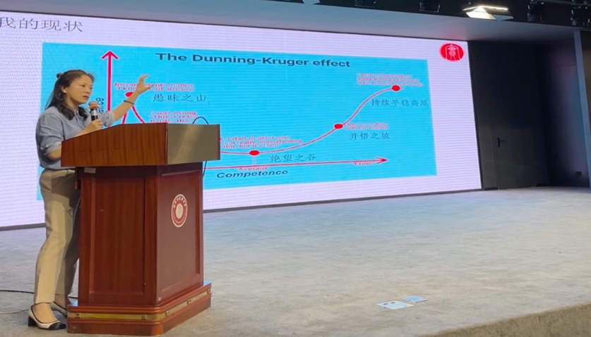 最后,温州市名师及实验中学英语教研员吴舒兰老师带来了题为《核心素养导向的初中英语作业设计实践与反思》的分享,提出以核心素养为导向的作业应以单元为基本单位、应包含项目化作业、要让思维可视化、要结合学生的身心特征、要巧用现有材料因需设计以及不能从一个极端走向另一个极端共6点深刻建议。结合本节课例、实验中学英语组项目化学习的实践经验以及新课标要求,吴舒兰老师指出:“项目化学习的意义,就在于变被动的接受型学习方式为主动的探究型学习方式。”最后,吴舒兰老师用桥本武的名言鼓励教师们,不要畏惧新事物,将项目化学习的开展视为富有意义与成就感的探索,并祝福大家早日登上达克效应图的开悟之坡。
