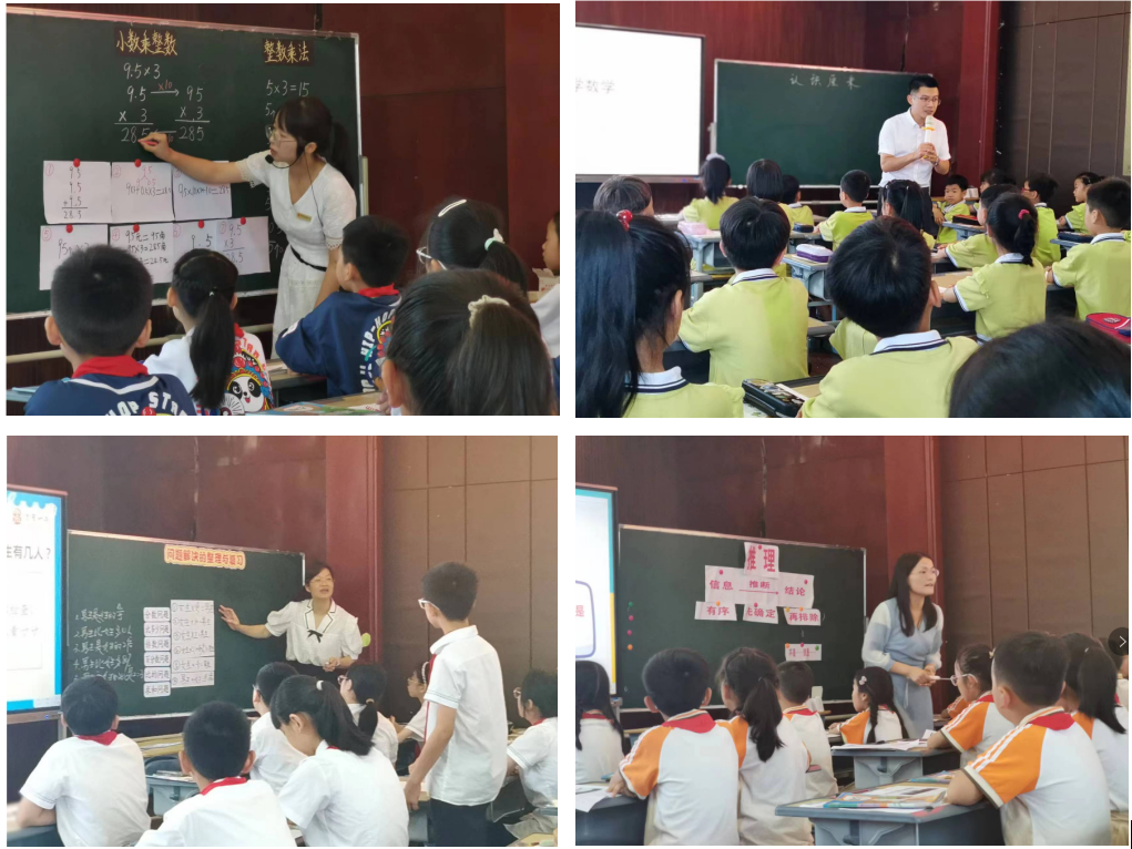 水头一小周冰倩、虹桥镇第十二小学的翁士应、昆阳镇第一小学徐小巧、水头一小杨绍霞老师分别为大家带来《小数乘整数》、《认识长度》、《问题解决的整理与复习》、《简单的推理》的课例展示。周冰倩老师引领学生借助转化单位、计数器、计数单位等原有知识解决新问题,关注教学的一致性,重点去理解不同算法的内在联系;翁士应老师基于学生本位,通过工具选择、尝试测量、问题交流等活动,让学生在认知冲突中感知统一长度单位的必要性,经历厘米单位产生的过程,在估测测量中建立量感;徐小巧老师通过一题多补融会贯通地引导孩子们将问题解决的数量关系式归纳为“加法:部分量+部分量=总量,乘法:单位‘1’×()=比较量”这两条,从整体结构上建构数量关系式;杨绍霞老师借助小侦探柯南引导学生“有理有据地阐述”,交流沟通文字、连线、列表等不同的推理方法,建立“三个信息,先确定一个,变成两个信息”的判断策略,有意识地培养学生的推理意识。