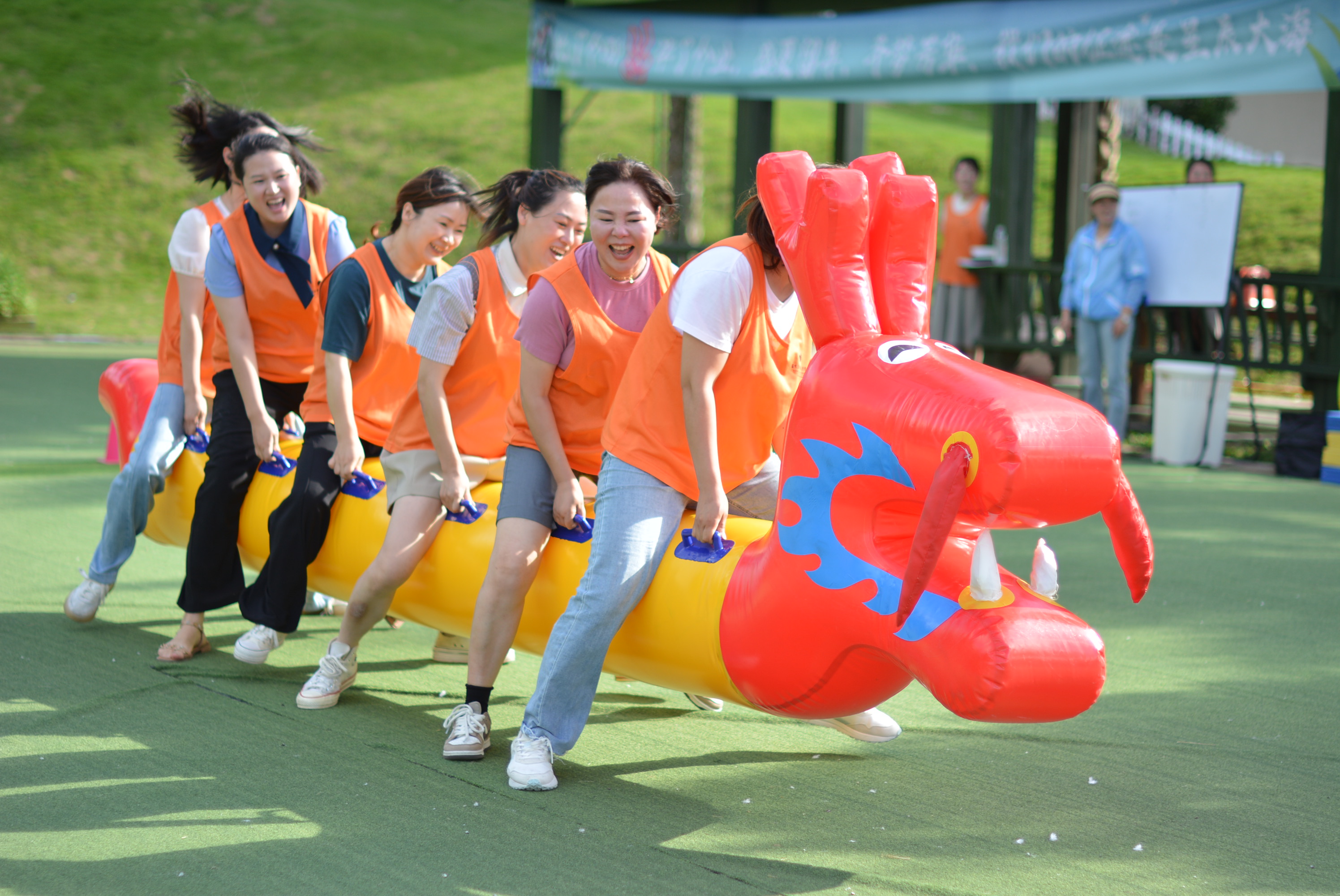 “左、右;左、右”,队员们喊着整齐的口号齐心协力往终点走去,看看哪队先到达终点。