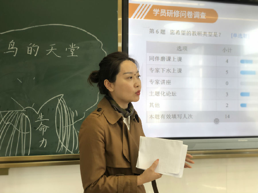 破冰活动后,吴秀娟名师作了活动小结。吴老师先反馈前期的问卷调查情况,据此梳理出学员们的研修需求。随后,吴老师向大家展示了自己购买的各类专业语文教学杂志,她借此谈学员该如何提升自己的专业素养,并提出了学员的研修目标:向下扎根,向上拔节。一个教师的成长,离不开阅读。吴老师说我们读备课书籍、教育杂志和教育书籍,学习最前沿的教学理念,有助提高文本解读能力。还可增加休闲书和生活书的阅读,跳出语文看语文,在解读文本时,会有意想不到的效果。她还提出文本解读需体现三方面:一是文本自身独特的价值;二是文本所在单元的价值;三是学生本位的文本价值。她希望学员们不要漫无目的地前行,要用心持续地做好一件事,并给我们推荐了与文本解读有关的两本书籍《课文细读》和《解读语文》。最后,吴老师宣布了本工作室的研修制度,布置了研修任务。