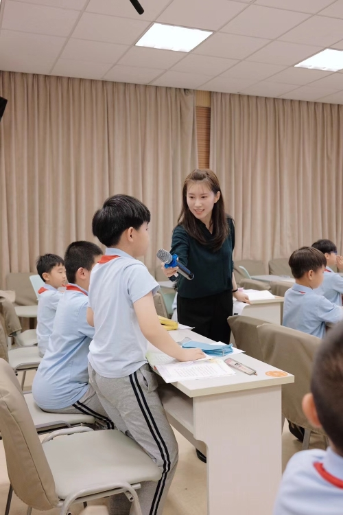第三节课吴孔裕工作站的陈思老师执教了三年级《海底世界》一课。陈老师精准解读单元语文要素,让学生通过小组合作学习了解海底动物活动方法的不同特点,理解“免费的长途旅行”等生动的表达,体会表达效果,并感受第4段围绕“海里的动物,各有各的活动方法”写清楚的写法,仿说其他海洋动物活动,在任务驱动中将学生推向了深度学习。