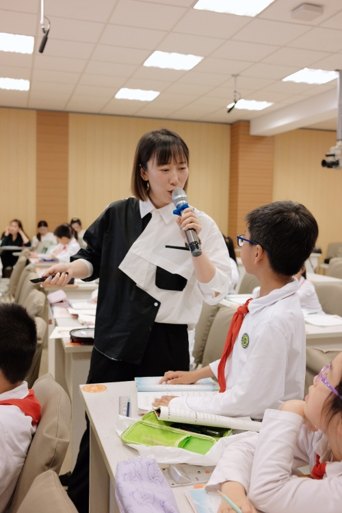 第一节课是林丛工作室的余静老师和二(8)班孩子们共同学习的《当世界年纪还小的时候》。课堂伊始,余老师以问激趣,创设情境,带领学生穿越到世界年纪还小的时候,通过“学习任务一:开启奇妙之旅”带领学生整体感知太阳学会发光和上山下山,月亮学会了不断变化,水学会了流动。随后,余老师以“学习任务二:探索奇妙之旅”为引,让学生通过自由读、集体读、个性读,探究太阳、月亮、流水是怎么学习本领的,最后激励学生展开想象,围绕“学习任务三:读写奇妙之旅”进行大胆创编并交流分享。整节课以识字写字朗读任务贯穿始终,又适度指向深度学习,体现了第一学段语文学习活动的有趣与扎实。