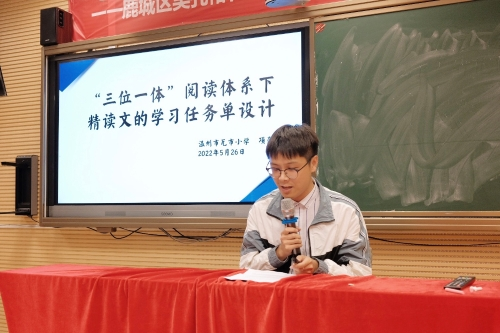 吴孔裕工作站的项豪镭老师做了题为《“三位一体”阅读体系下精读文的学习任务单设计》的任务设计说明。项老师从“三位一体”阅读体系和“学习任务单”的概念出发,从指向阅读学习的策略、指向表达方式的迁移、指向语文技能习得、指向语言欣赏积累和指向思维力培养五大方面进行分享。