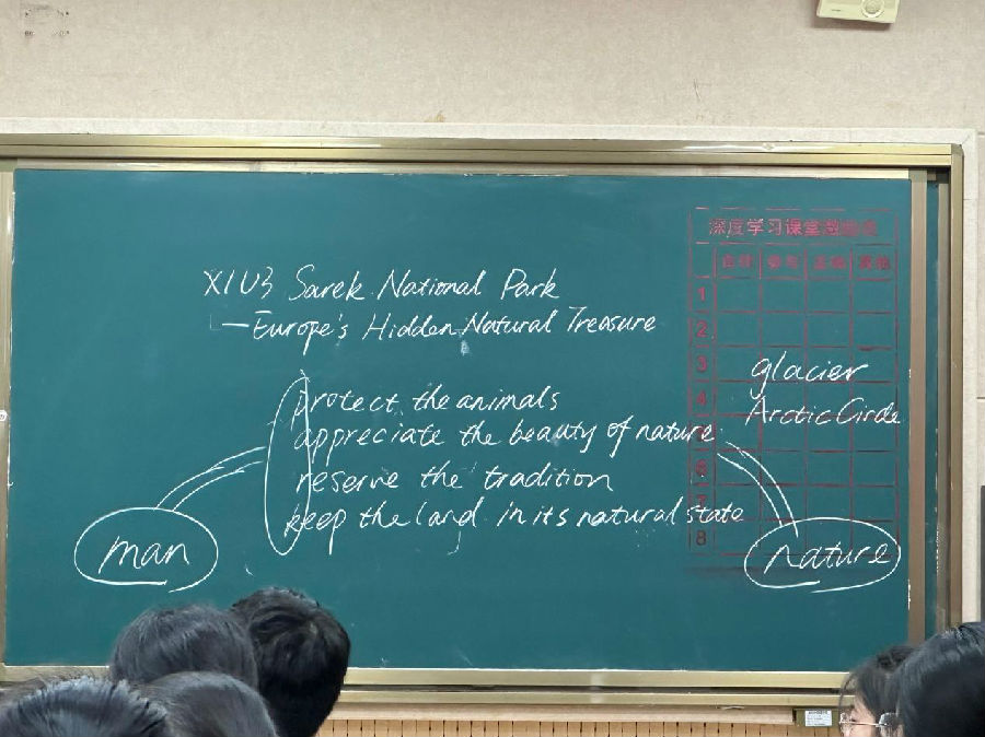 温外高中的陈冰颖老师执教选择性必修一第三单元 Fascinating Parks阅读课。作为阅读课的第一课时,陈老师以让学生明白 “Why do we need to build national parks?”为目标,引导学生阅读课文、表达理解并进行总结,最终得出“国家公园是架起人与自然联系的桥梁暨人与自然和平共处”的结论。值得一提的是,本节的板书设计精美流畅、明了扼要,亮点突出。