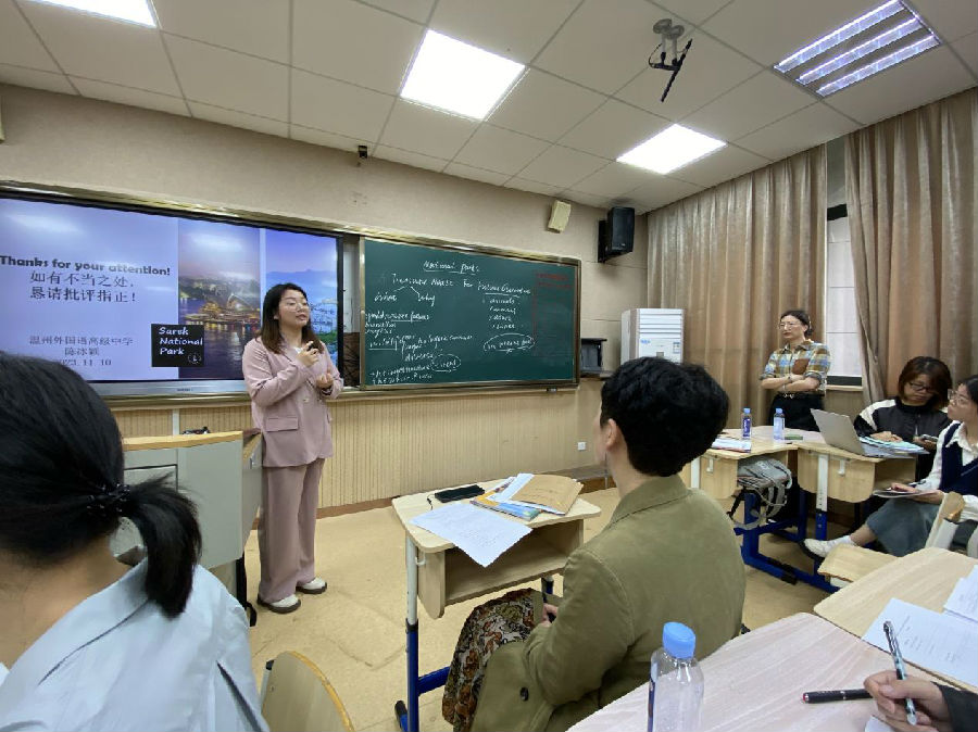 针对第二节课,来自温州人文高级中学的郑逸兰老师点评王旭碧老师的课。她认为整节课堂教学流畅,衔接自然。教师循循善诱,课堂氛围轻松。教师目标明确,全程紧扣主题,形散神不散,教师自然地从情感上引导学生环境保护的重要性。同时,她建议王老师将后面提到的“建立国家公园的迫切性”与前面提及的“国家公园的建立可能是由于受到了一些障碍”相结合。来自平阳二中的王小芳老师认为该课教学让人印象深刻。在教师的有序引导下,学生开展自主阅读、深度阅读和整理阅读,课堂具有高度的生成性。潘老师认为,教师与学生之间的交互感非常好,同时教师展现了一定的个人魅力。