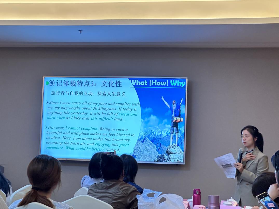 接着,陈冰颖老师和王旭碧老师分享了她们对XB1U3 Reading and Thinking和Expanding Your World两个板块文本中的文化因子解读。陈冰颖老师立足游记体裁真实性、文学性和文化性的三大特点阐明了文本隐含的文化因子。王旭碧老师结合国家公园研究院发表的最新文章《世界国家公园:起源、演变和发展趋势》分享了对文本的内在文化内涵进行了深入细致的解读。