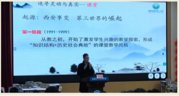 张老师结合自己的教学轨迹以及课例,分享了教学风格形成的三个阶段,分别是:第一阶段为激发学生的兴趣探索出了“知识结构+历史社会典故”的课堂教学风格;第二阶段为了走出一条适合农村教学实践的课堂教学路子,在不断的积累和沉淀中形成了“阅读—质疑—探究—答疑—自评互判—拓展(解决实际问题)”的教学风格;第三阶段反对繁琐的教学环节,主张教学资料反复利用以及主张培养学生解决问题的能力,从而形成了简约朴实、真实灵动的教学风格。