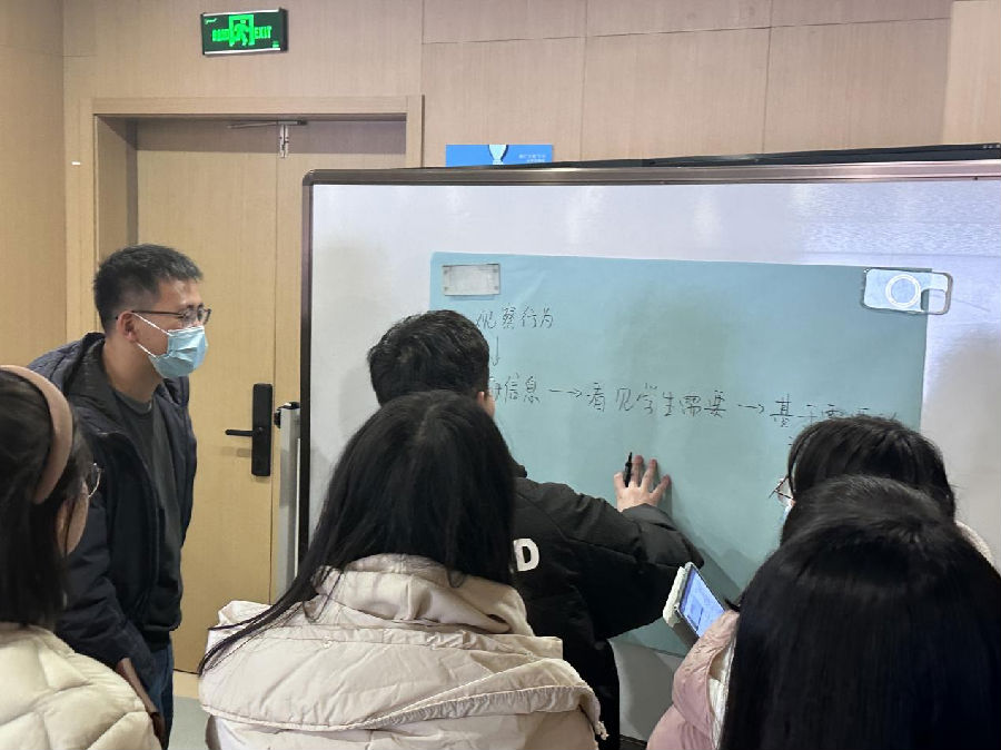 当天晚上,方海东老师进行了点评与指导,通过对典型案例的分析,引导我们总结出了:“学生想要什么,我们就给什么,关键在于怎么给”而又通过亲身经历为我们讲述,应该要发现学生身上的优点,并将优点以文字的形式呈现。这更能拉近师生之间的距离,学生会更愿意和教师交流。
