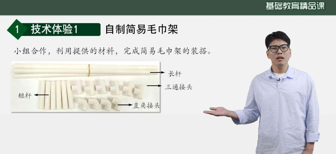 接到任务选定课题后,随即认真研读课程标准与教材,并着手准备教学素材,经过多番考量,最终以“制作简易毛巾架”的制作与装搭为本节课的主要技术体验项目。本节课创设了贴近学生生活实际的任务情景,采用活动体验式的教学方式,通过逐字稿不断打磨课堂语言,使枯燥乏味的概念性内容教学变得生动与具体。整节课教学环节紧密联系,层层递进,通过动手实践落实了通用技术的学科核心素养。