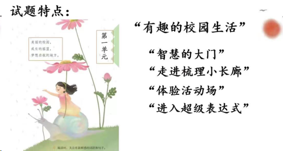 余玉仙、陈洁两位老师设计的第一单元试卷以“有趣的校园生活”为主题来设计,围绕这一主题设计了打开“智慧的大门”“走进梳理小长廊体验活动场”“进入超级表达式”这几个板块。两位老师设计的试卷考察全面,难易适中,同时能结合第一单元的语文要素“阅读时,关注有新鲜感的词语和句子”进行设计,并将语文融入生活,结合生活实际命题。