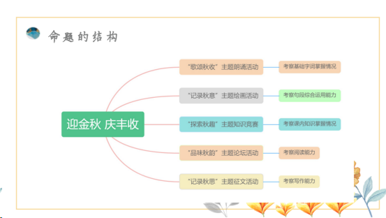 王泓颖、洪伟玲两位强调在设计命题情境时,最重要的是要统整,要立足整体,打造主题情境。教师在命题时应树立整体意识,通过主题情境的统领,对试卷所选素材进行整体规划和深度整合。两位老师分享了设计情景的三点思路,第一,可以依托教材,牵主题之线。第二,走进温州,循生活之迹。第三,第聚焦时政,展时代之音。根据这几点两位老师立足整体,设计了“迎金秋 庆丰收”主题情景的期中卷。