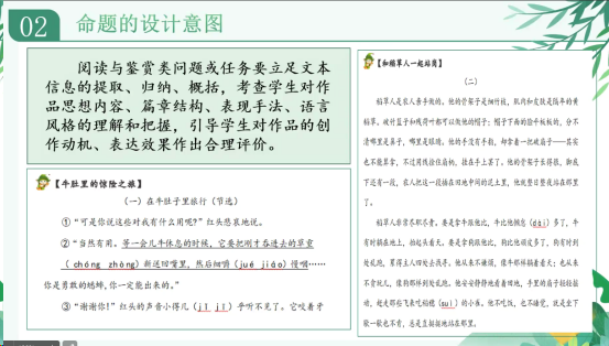 徐妙秀、王斯莹两位老师关注阅读与鉴赏类问题,认为这类问题要立足文本信息的提取、归纳、概括,考查学生对作品思想内容、篇章结构、表现手法、语言风格的理解和把握,引导学生对作品的创作动机、表达效果作出合理评价。