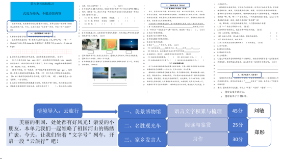 郑彤、刘敏两位老师根据单元语文要素设计了“云旅行”的情景,让学生在旅游的过程中考察自己各方面知识的掌握情况,包括基础字词掌握情况、阅读与鉴赏能力、写作能力等。
