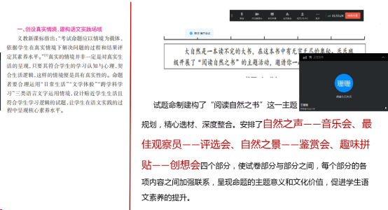 吕晓雷、蔡文怡两位老师关注试卷中真实情景的创设,提出要建构语文实践场域,通过在日常生活情境中解决实际问题,在文学体验中建构阅读经验,在跨学科学习中拓宽学习维度等。同时在设计试卷的时候紧扣课程目标,发挥试题导学功能。