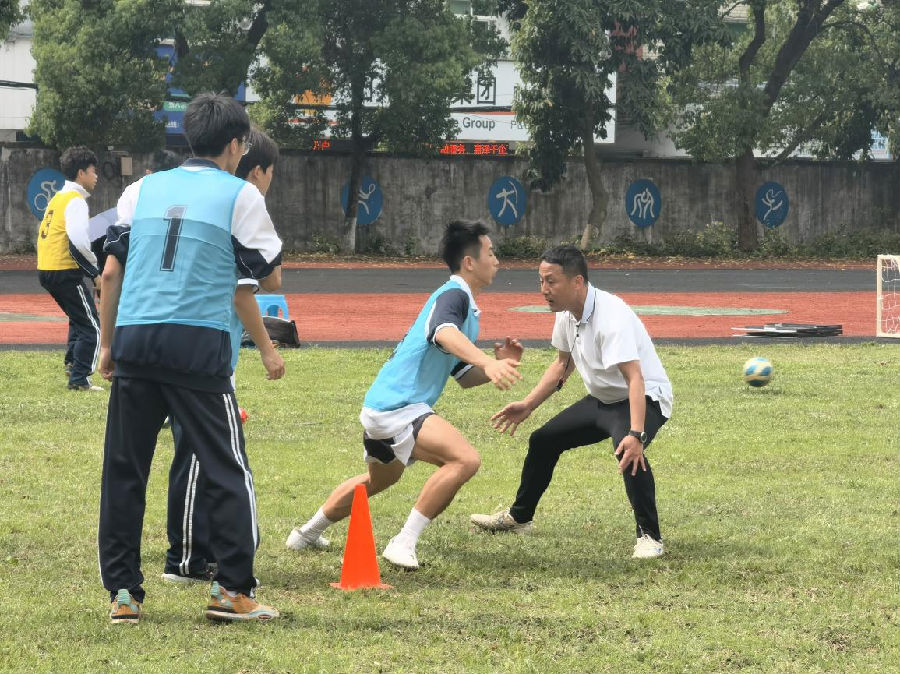 同时在另半场展示的是来自温州市绣山中学的张洪江老师,他带来的是《足球脚背不同部位运球的练习方法1》。张老师基于学情,以问题为导向,通过“为什么要强化一步一触球”、“曲线运球时如何控制球的方向”、“运球过人的技术要点有哪些”这三个问题引导学生体会不同脚背触球部位和运球过人的技巧。同时张老师借助任务单提升小组化学习的合作,通过自评、小组评价等精准评价本课的学习效果。