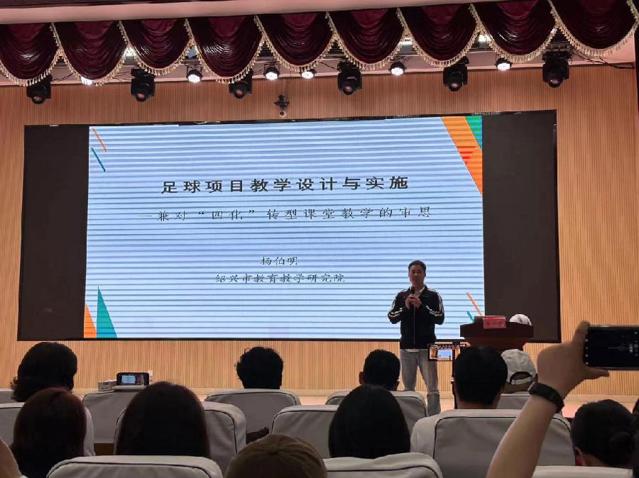 接着由绍兴市教育教学研究院体育教研员杨伯明老师就《足球项目的教学设计与实施--兼对“四化”转型课堂教学的审视》进行专题讲座。杨老师认为应围绕核心素养去落实三有四化课堂教学,并注重评价精准化,不为评而评,保持课堂教学的完整性。以“赛”“学练三个一”评价学习过程,认为评价的关键不仅是评价表,更是学练标准。最后杨老师以“一心二用三有四化五有六突出七要”对教学设计与实施进行总结。